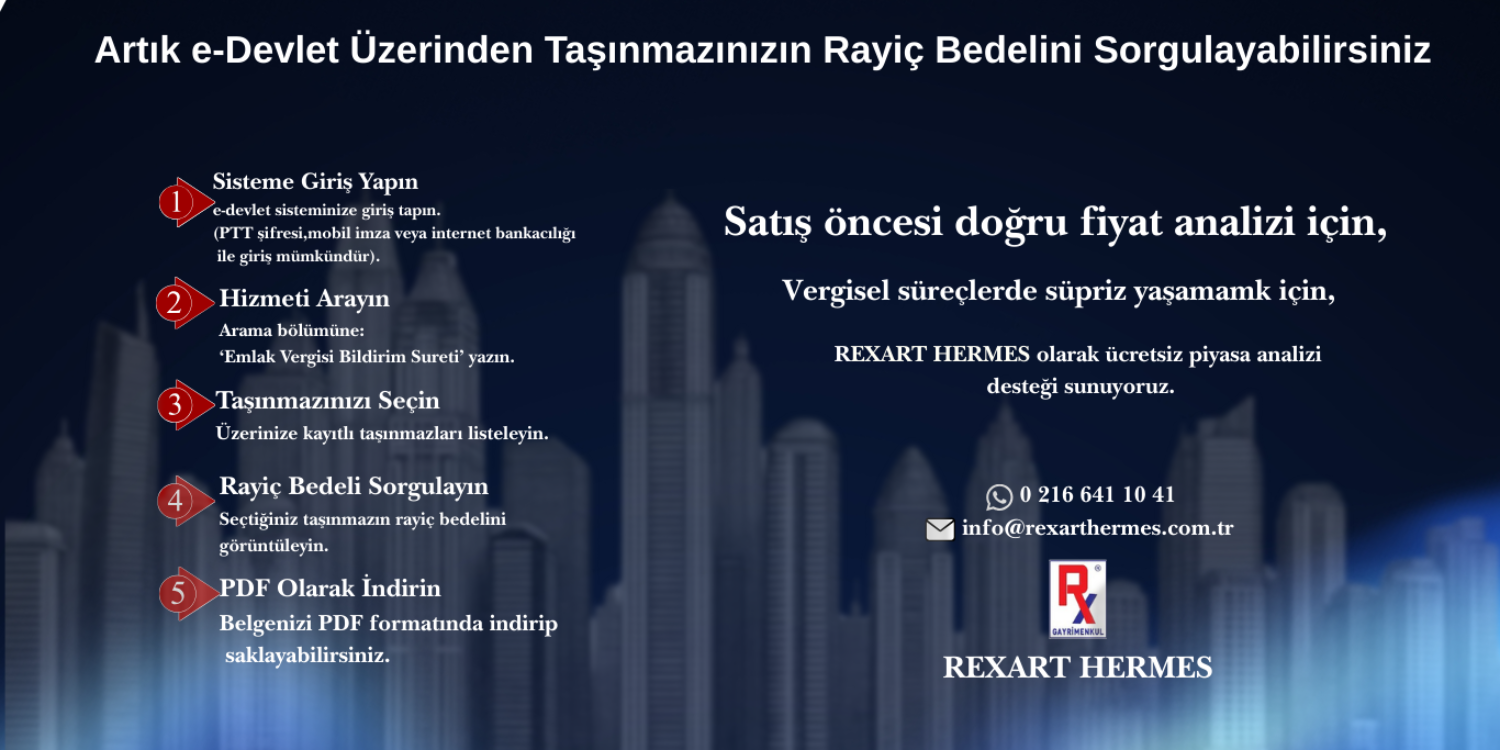 REXART HERMES Gayrimenkul olarak müşterilerimize gayrimenkullerinin değerini doğru şekilde analiz etmeleri için profesyonel destek sunuyoruz. Amacımız, taşınmazlarınızın gerçek piyasa koşullarına uygun şekilde değerlendirilmesini sağlayarak satış sürecini daha sağlıklı ve hızlı hale getirmektir.